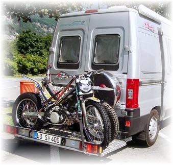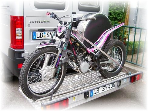 1. Bewährungsprobe mit Bravur bestanden.......................... Anruf von Obermeitingen: die Motorrad Plattform ist da und kann angebaut werden, damit die Trialmaschinen auf dem "Solypopo" schneller (über 80 Km) durch Europa transportiert werden können..............