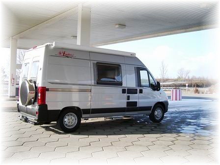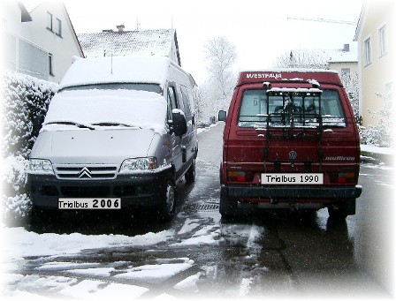 09.02.2006: Hurra, hier steht er nun in der Produktionshalle, unser "Neuer Trialtransporter" von Bavariacamp. Zu unserer Freude ein Jubiläumsbus, der 400. SOL Y SOMBRA der gebaut wird. Kaum zu glauben, dass im Laderaum dieses Kastenwagens innerhalb weniger Tage ein gemütliches Wohn-/Schlafzimmer, eine Küche, eine Einliegerwohnung mit zwei Stockbetten, separaten Zugang über die Terrasse (Motorradplattform) und ein "Badezimmer" mit Dusche, Waschbecken und Toilette entstehen sollen. Bereits für den 27.2. ist die Abholung geplant. Auf der nachstehenden page noch mehr Infos über den genialen SOL Y SOMBRA. http://www.camping-bus.de/WoMos/soly2.html |