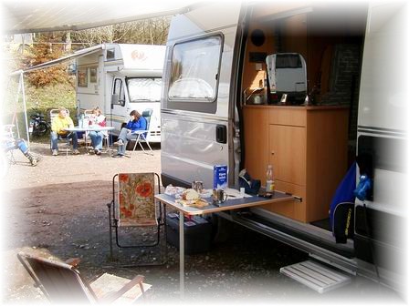 31.03.2006 ups, schon sind wir wieder im Großheubacher Trialtrainingszentrum, mit dabei unser neuer Trialbus und der von vielen bewunderte geniale "Kombi Innen/Außentisch" mit Durchreiche ............. | |