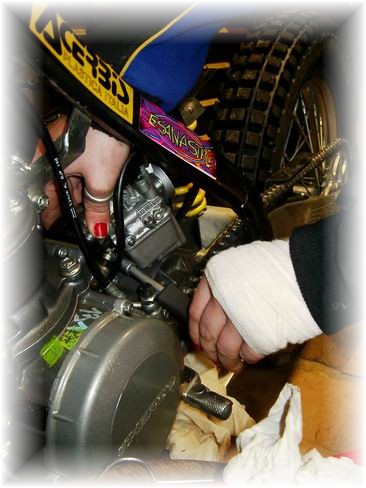 was geht ? 2007 werde ich meine Sherco (nach gemeinsamer mit Opa Gerhard erarbeiteten Checkliste) selbst richten. Luftfilter, Vergaser, Kette............... alle Schrauben auf festen Sitz kontrollieren............. Probelauf.............. "übrigens der Verband an der Hand stammt vom Reiterunfall mit dem Pferd" ging Gott sei Dank glimpflich aus ...........riesen Bluterguss am linken Bein, verstauchte Hand und jede Menge blaue Flecken | |